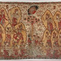 6207-212: Schildering op doek, een verteldoek met een verhaal uit de Mahabharata of mogelijk een langse, een gordijn dat bij feestelijke gelegenheden langs de dakrand aan het open huis werd gehangen. Voorstelling met plantaardige en minerale verfstoffen op het met stijfsel geprepareerde en met een schelp geglansde doek aangebracht. Voorstellen: binnen een rand van geometrische figuurtjes in groen en rood, een landschap met gele rotspartijen, de lucht, atmosfeer aangegeven door vele 'ogen'. In het midden een makara kop (Vishnu?) met een onthoofd en onthand lichaam. Zittend op een 'troon', rood van kleur, Korowo, de kwade partij uit de hals ontspruit een boom (levensboom?). Aan de linkerzijde de god Kreshno, in aanvalshouding en vele figuren van de goede en drie van de kwade partij. Waar onder een tegenhanger van Semar, op de grond knielend voor de onthoofde. Aan de andere zijde, knielend Semar, de uit de hemel gestoten god, die de goede partij Pandawa helpt in hun strijd voor het goede. Andere figuren van de goede en kwade partijen en geheel rechts, tweede rij, Bima de reuzenzoon met de vingernagel waarmee hij vijanden verslaat. Hij kan vliegen bovendien.