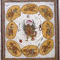 'A favourite subject of ceiling paintings is the eagle Garuda surround by gods, an incident from the Adiparwa creation story, the first book of the Mahabharata. Showing the Balinese conception of direction and orientation, eight gods representing the cardinal points of the compass attack Garuda for stealing amerta, their water of immortality.' [ref uncovered exhibition label, 2004]