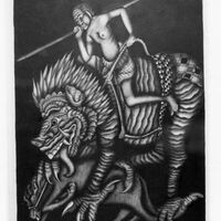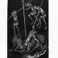 B627 Story: Prabu Gajah Deruma (Lawe). Soldier riding a crocodile monster killing a man on a horse.